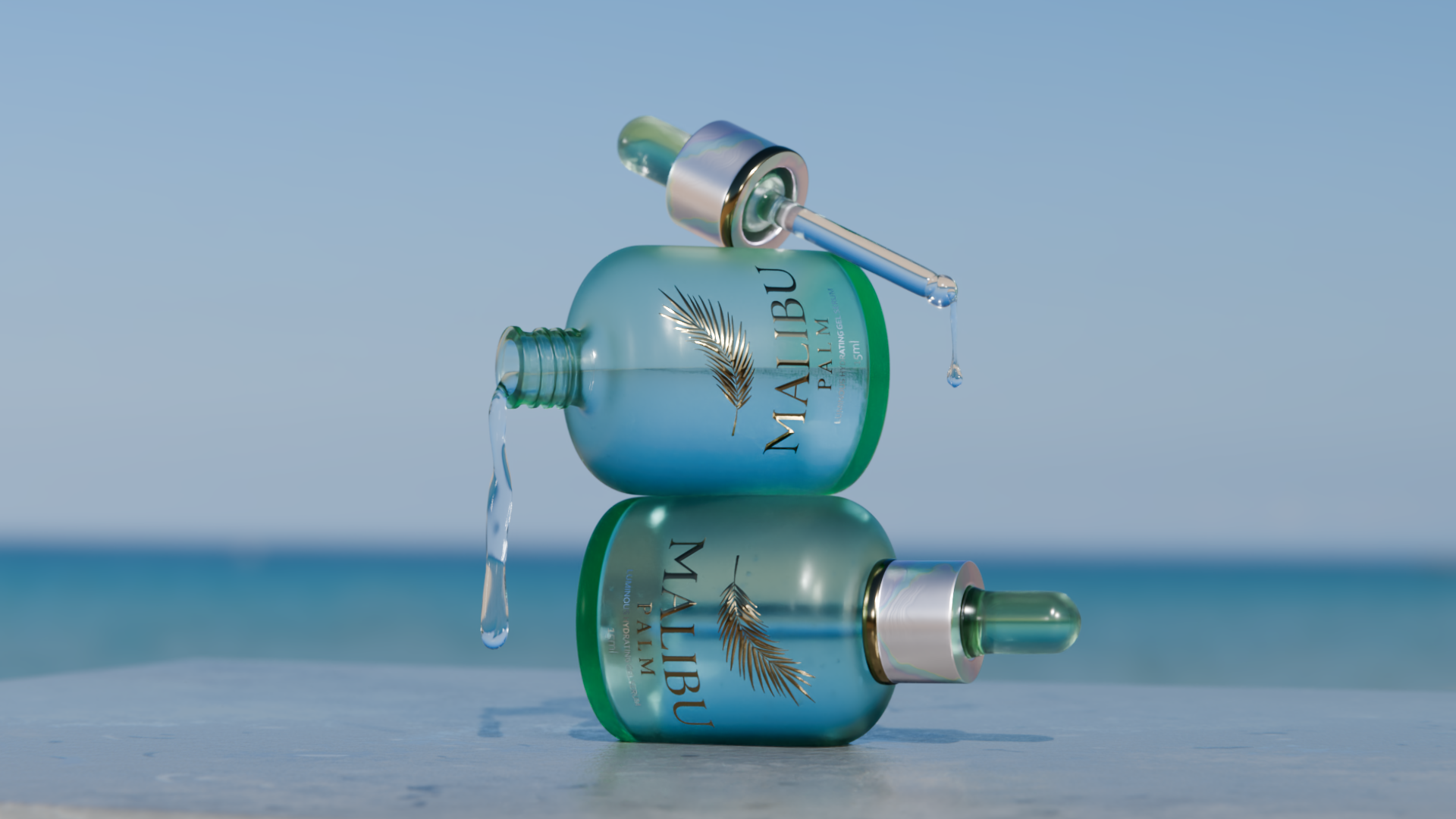 Das Projekt ‚Malibu Palm‘ umfasst die Gestaltung einer Kosmetikserie mit Fokus auf Produktvisualisierung. Die Produkte (Day- & Night-Cream, Serum, Showergel) präsentieren sich in einem frischen, saftigen Grün, veredelt durch ein goldenes Logo. Die Szenerie des Meeres und der Palmen im Hintergrund schafft eine idyllische Atmosphäre. Ein kurzer, von uns vertonter Werbeclip, der im Logo der Serie endet, rundet das Projekt ab. Eine visuell ansprechende Darstellung, die das Gefühl von Sommer und Entspannung vermittelt.